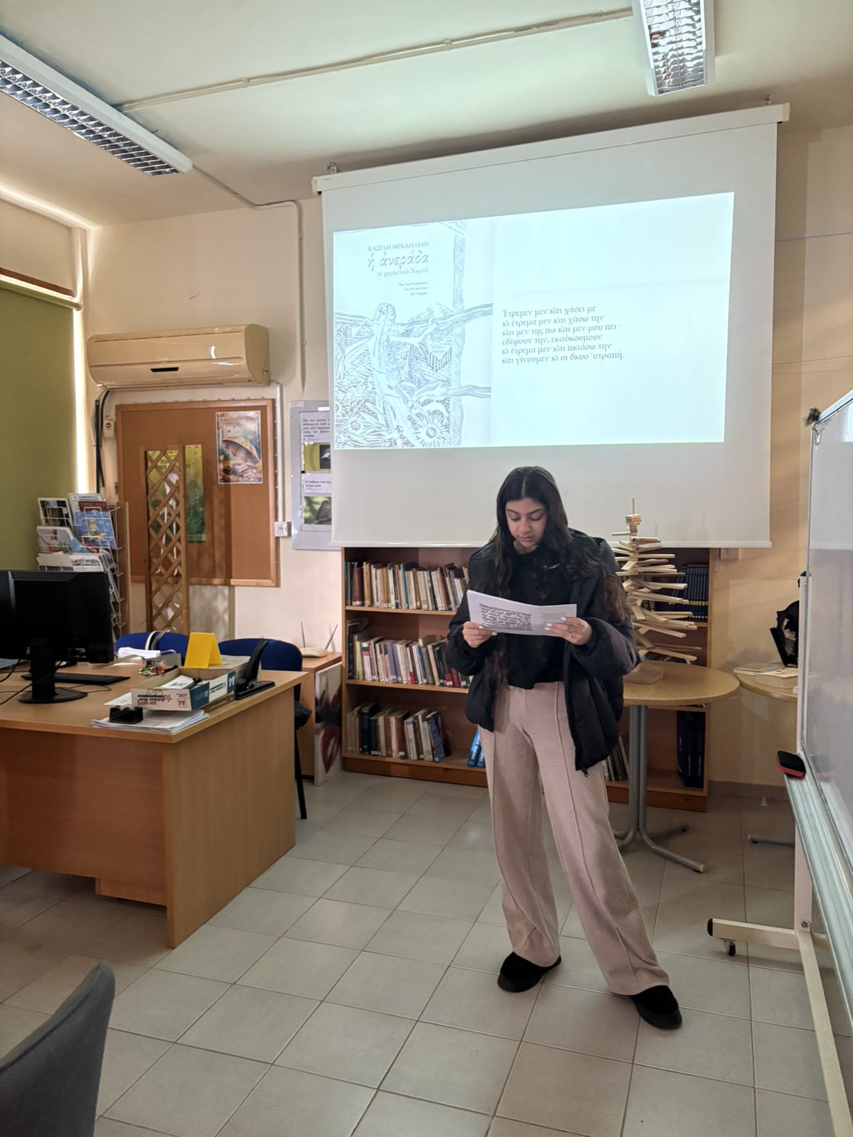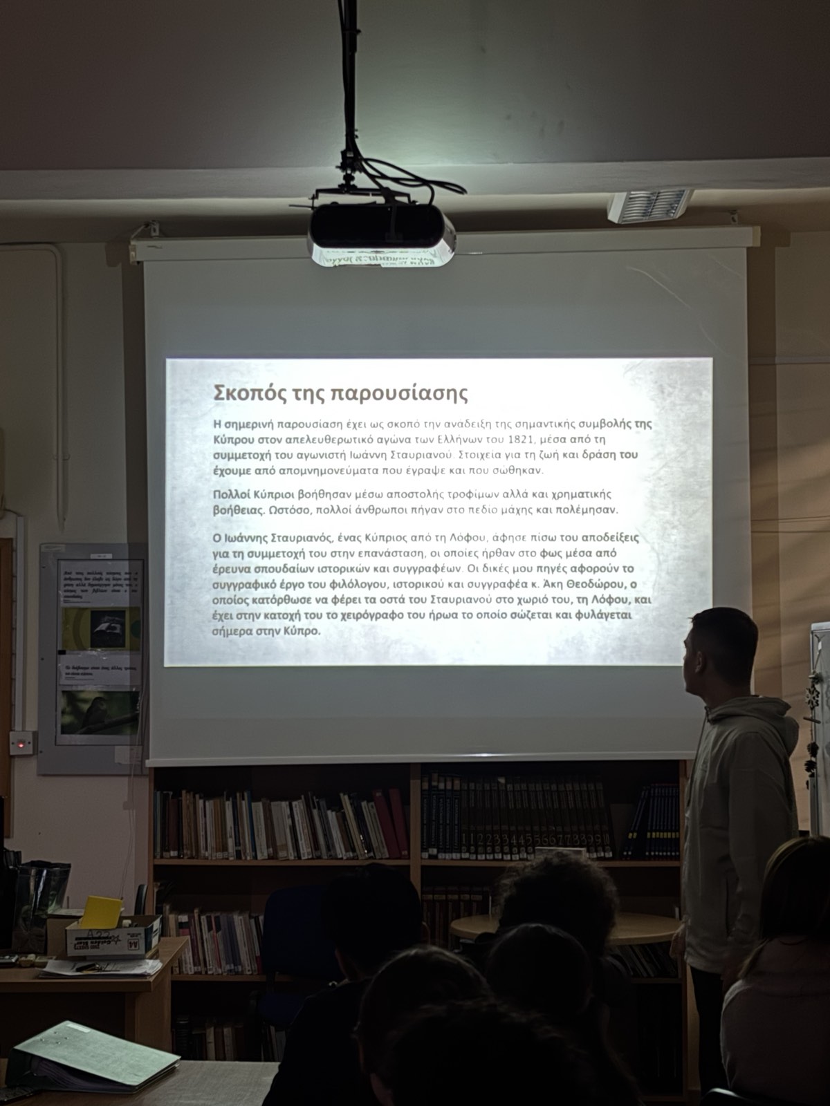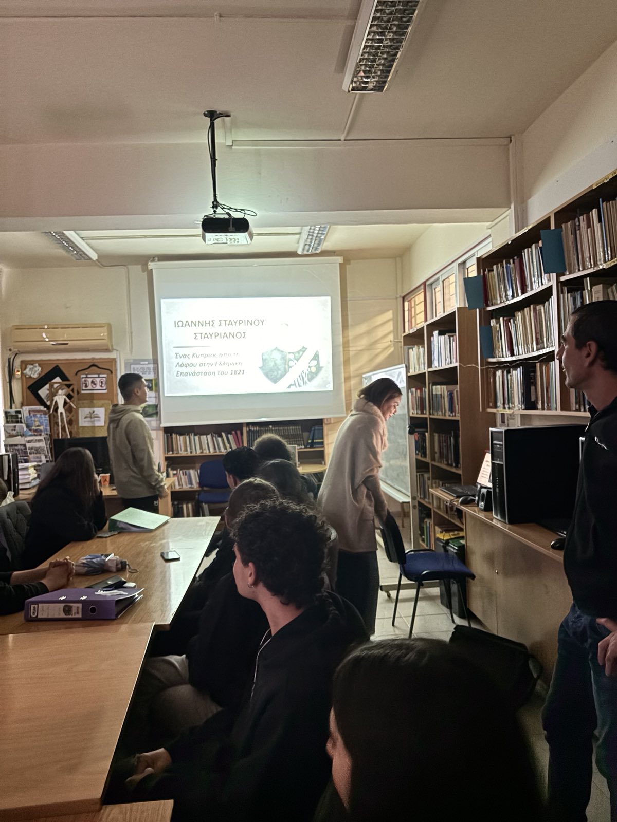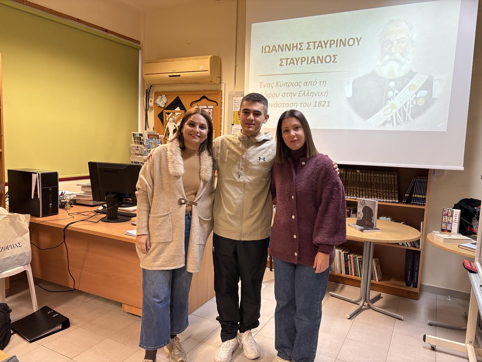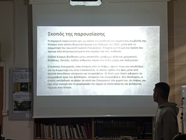 Στο πλαίσιο των δράσεων της Βιβλιοθήκης, για τον μήνα Δεκέμβριο, ο μαθητής Λεωνίδας Κωνσταντινίδης του Γ11 μας παρουσίασε τον Κύπριο αγωνιστή Ιωάννη Σταυριανό από το χωριό Λόφου, ο οποίος μυήθηκε στη Φιλική Εταιρεία και έλαβε μέρος σε σημαντικές μάχες της Ελληνικής Επανάστασης. Η παρουσίαση του μαθητή βασίστηκε στο βιβλίο του αείμνηστου συναδέλφου Άκη Θεοδώρου, "Ιωάννης Σταυριανός, ένας Κύπριος στην Ελληνική Επανάσταση του 1821".