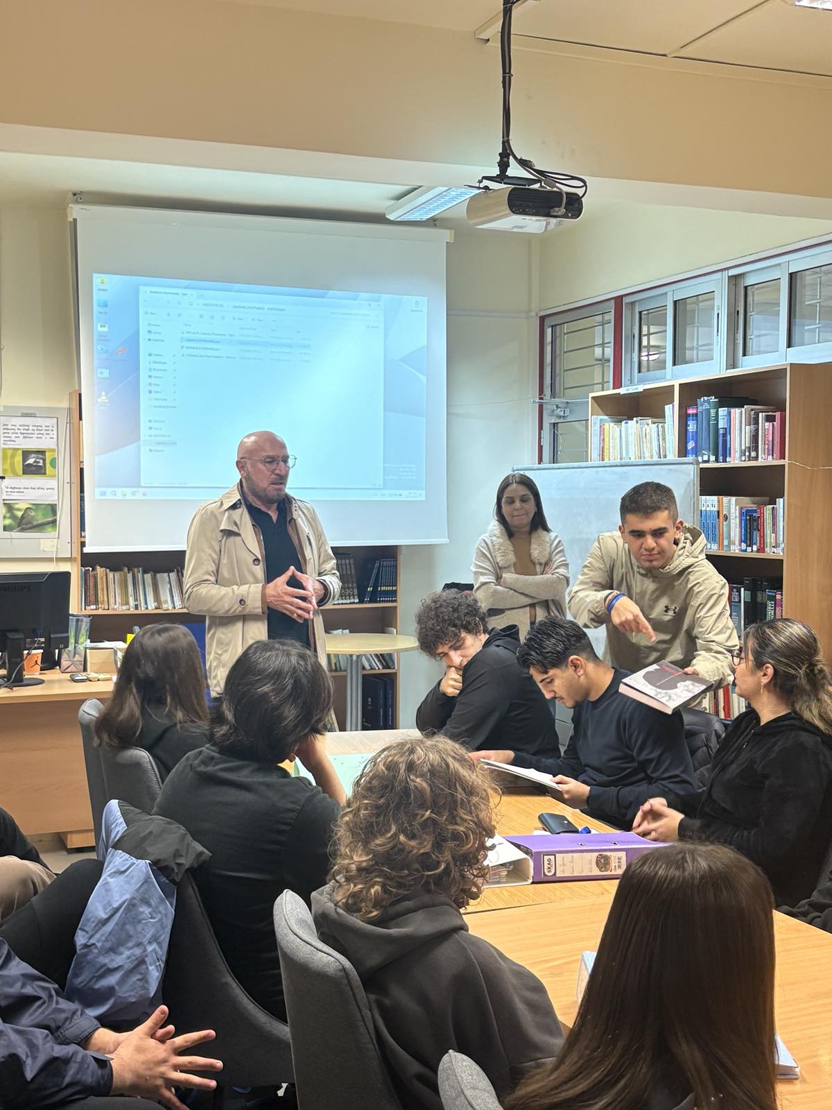 Την 21η Νοεμβρίου, Παγκόσμια Ημέρα Τηλεόρασης, επισκέφθηκε το Σχολείο μας ο Γιώργος Φράγκος, δημοσιογράφος, λογοτέχνης και Πρόεδρος της Ένωσης Συντακτών Κύπρου. Ο κ. Φράγκος μοιράστηκε γνώσεις και απόψεις σε σχέση με τη δημοσιογραφία, συνομίλησε με τους/τις μαθητές/τριες που είχαν την ευκαιρία να τον παρακολουθήσουν και απάντησε σε ερωτήματα που τέθηκαν περί θεμάτων των ΜΜΕ.